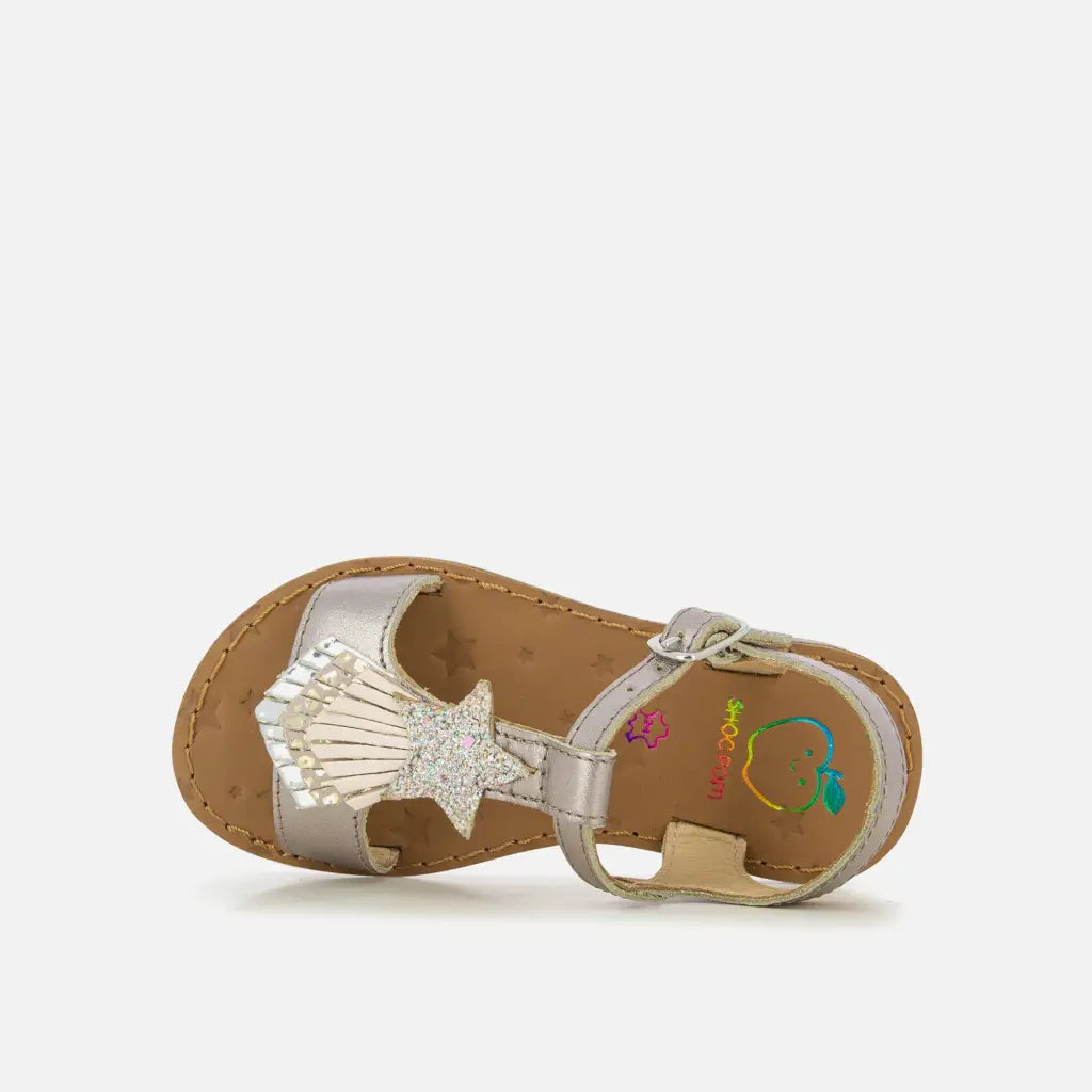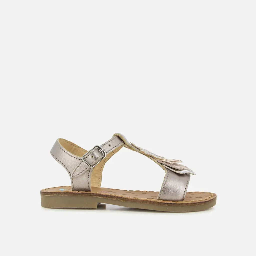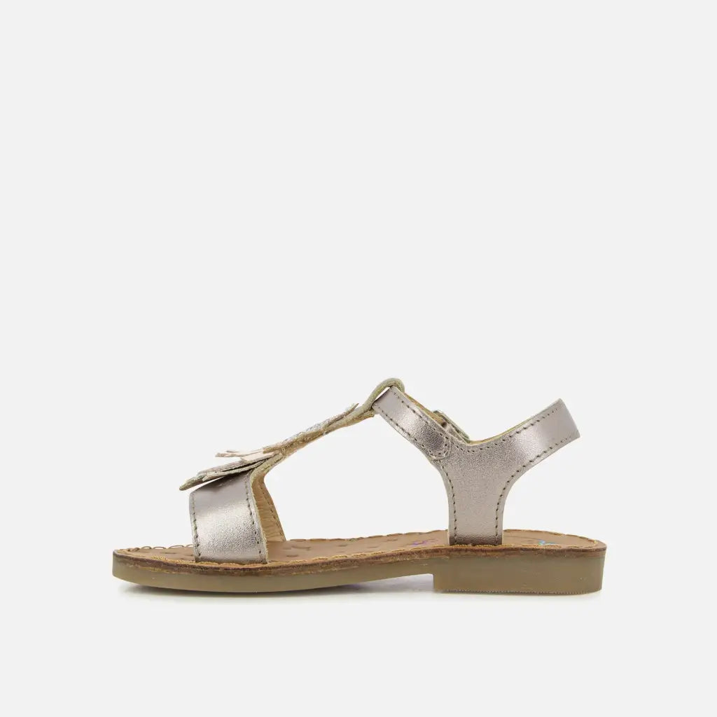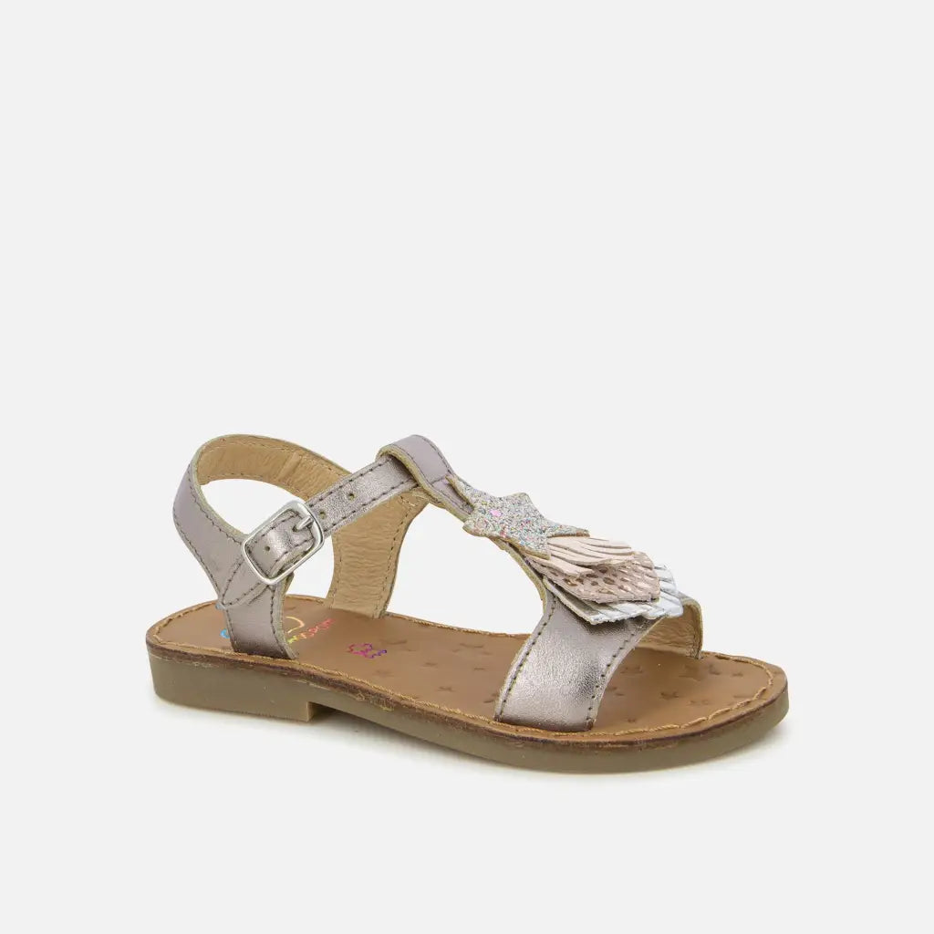 Happy Kid est une sandale pour enfants, présentée ici dans une version en cuir métallisé pyrite, avec des détails en textile glitter rose et argent. Cette chaussure est conçue à partir de matériaux de qualité : légère et souple pour le déroulement du pied. Elle se chausse et se déchausse facilement grâce à sa bride réglable.