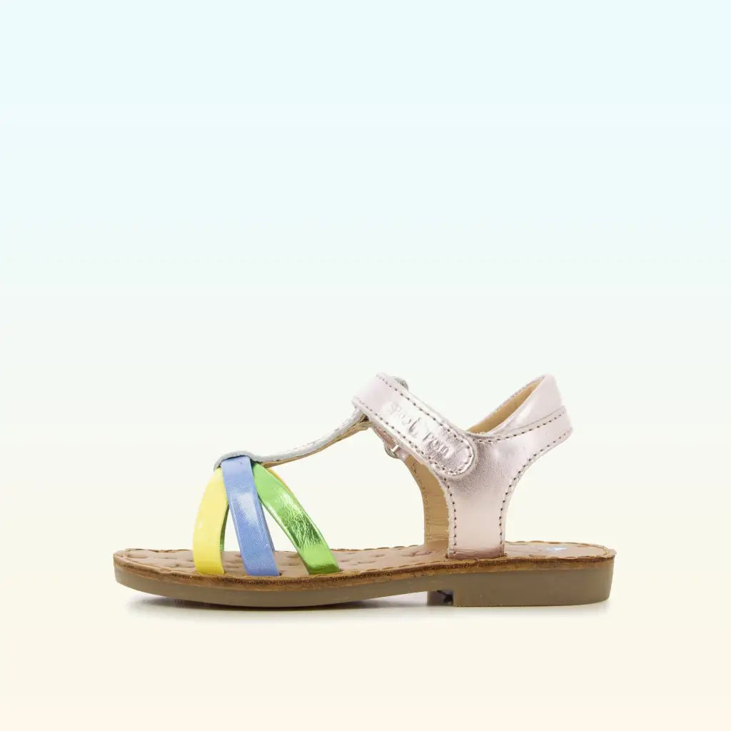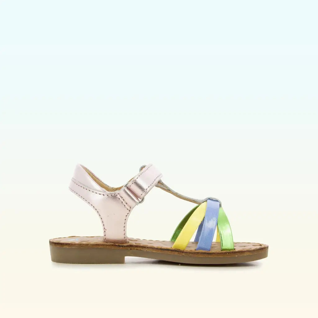 Cette sandale pour enfants est présentée dans une version en cuir métallisé violet, avec des brides multicouleurs. Cette chaussure souple et légère est conçue avec des matériaux de qualité pour le bon développement du pied. Elle se chausse et se déchausse facilement grâce à ses scratchs.