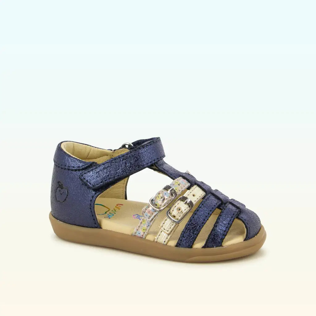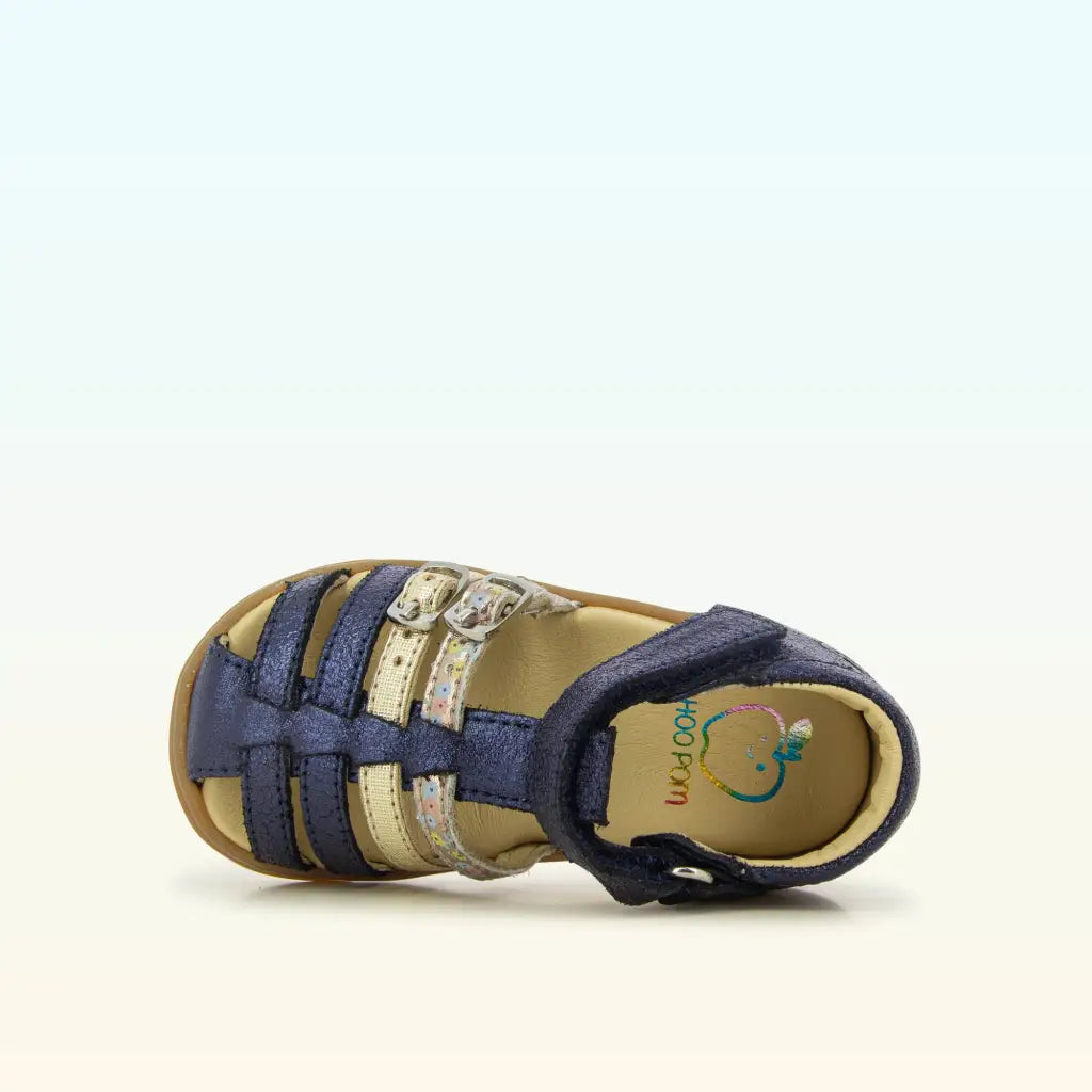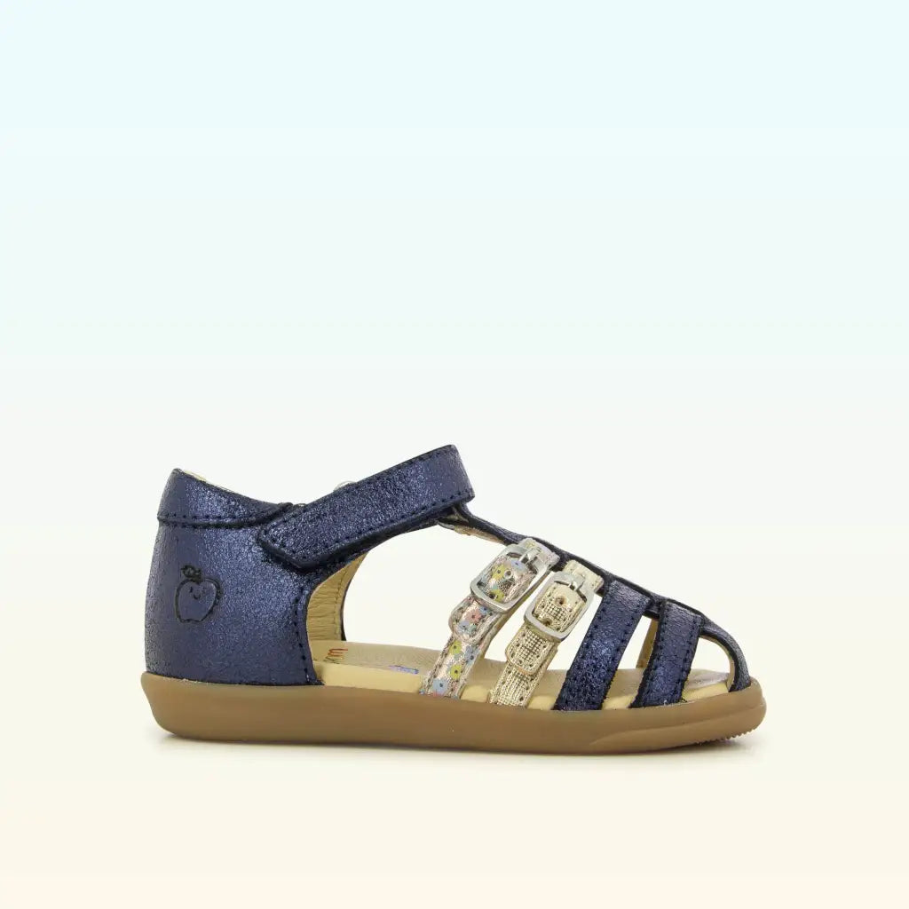 Pika Spart est une sandale premier-pas, présentée ici dans une version en cuir métallisé bleu marine, avec des brides en cuir fantaisie platine. Cette chaussure est conçue avec des matériaux de qualité : légère et souple pour le bon déroulement du pied de l'enfant. Elle se chausse et se déchausse facilement grâce à sa bande auto-agrippantes. Son bout fermé protège les orteils.