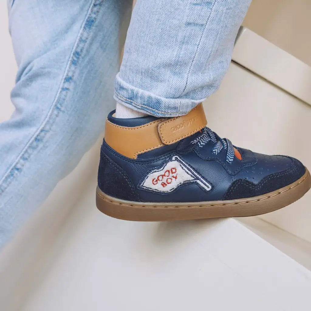 Cette basket à lacets pour enfants est présentée dans une version en cuir bleu marine avec un empiècement à message. Cette chaussure souple et légère se chausse et se déchausse facilement grâce à ses lacets élastiques et son scratch.