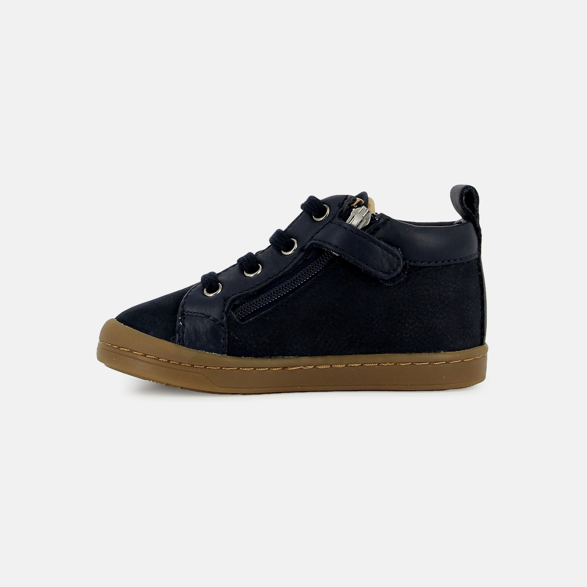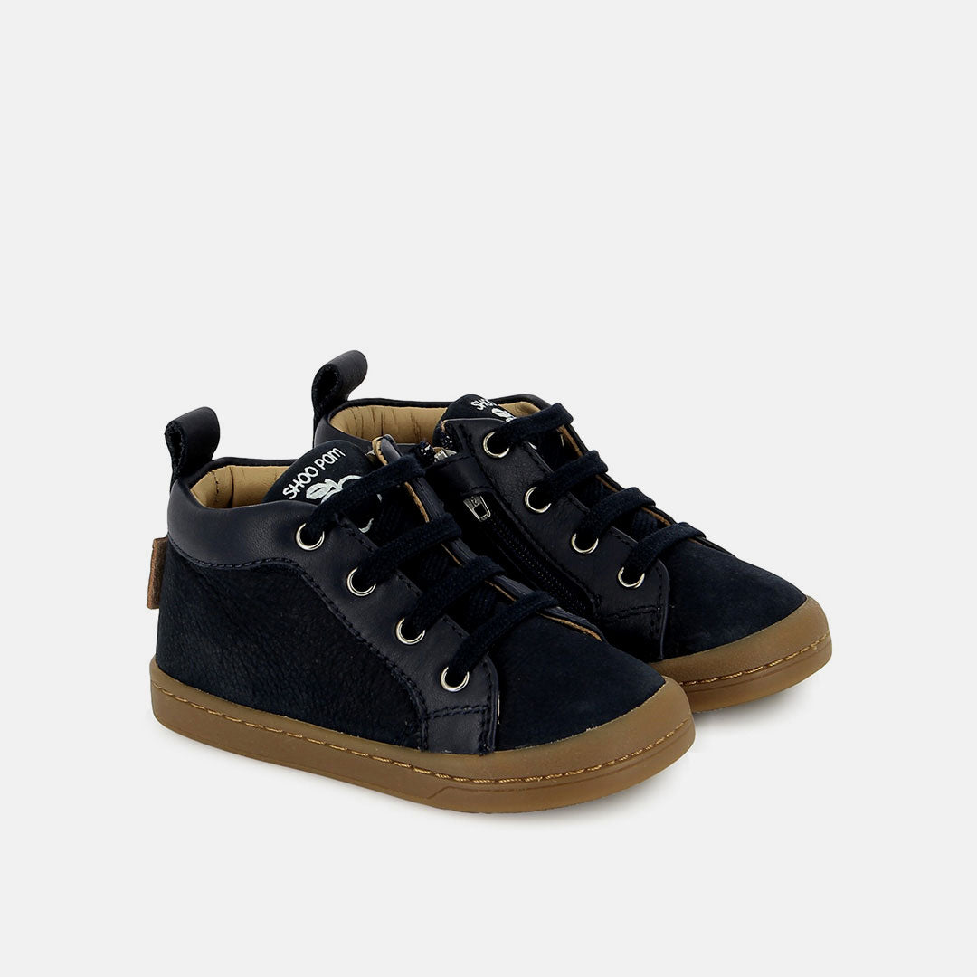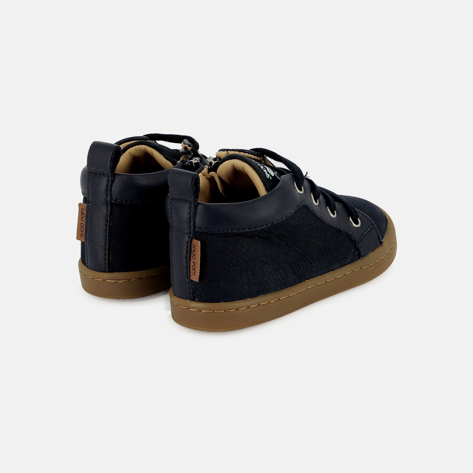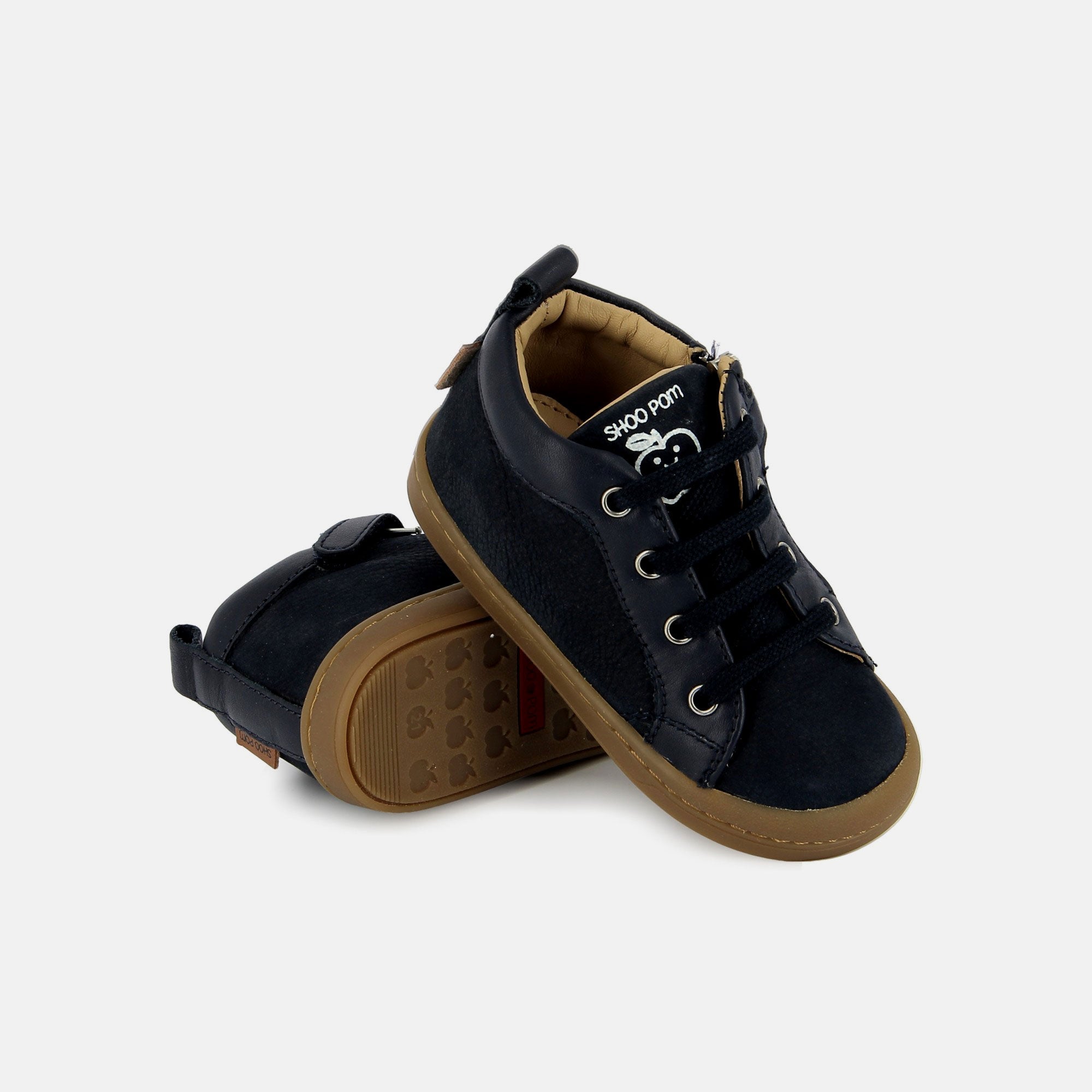Cette chaussure premiers-pas en cuir bleu marine Shoo Pom a été spécialement conçue pour accompagner bébé dans l’apprentissage de la marche, en alliant confort, maintien et liberté de mouvement.