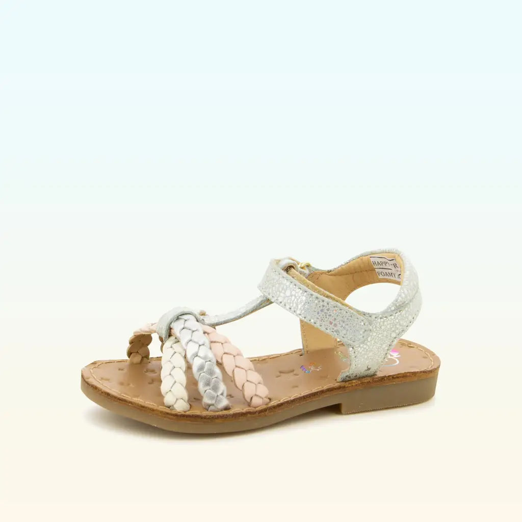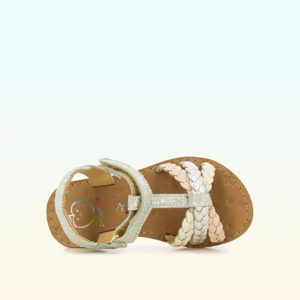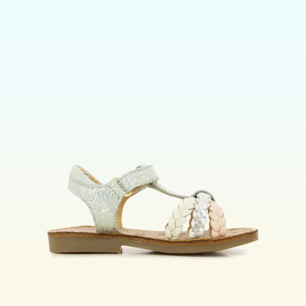 Cette sandale pour enfants est présentée dans une version en cuir pailleté blanc, avec des brides tressées multicouleurs. Cette chaussure souple et légère est conçue avec des matériaux de qualité pour le bon développement du pied. Elle se chausse et se déchausse facilement grâce à son scratch.