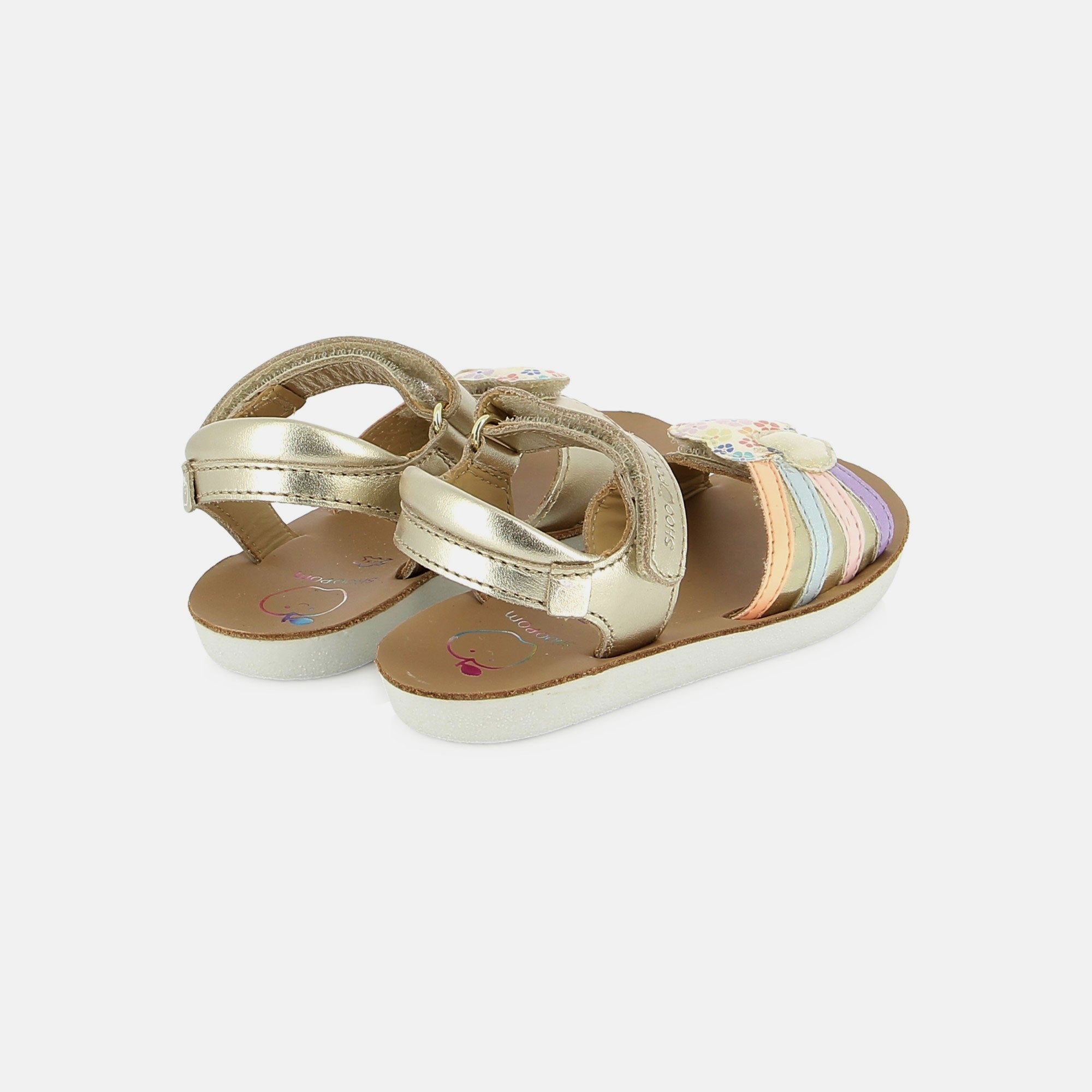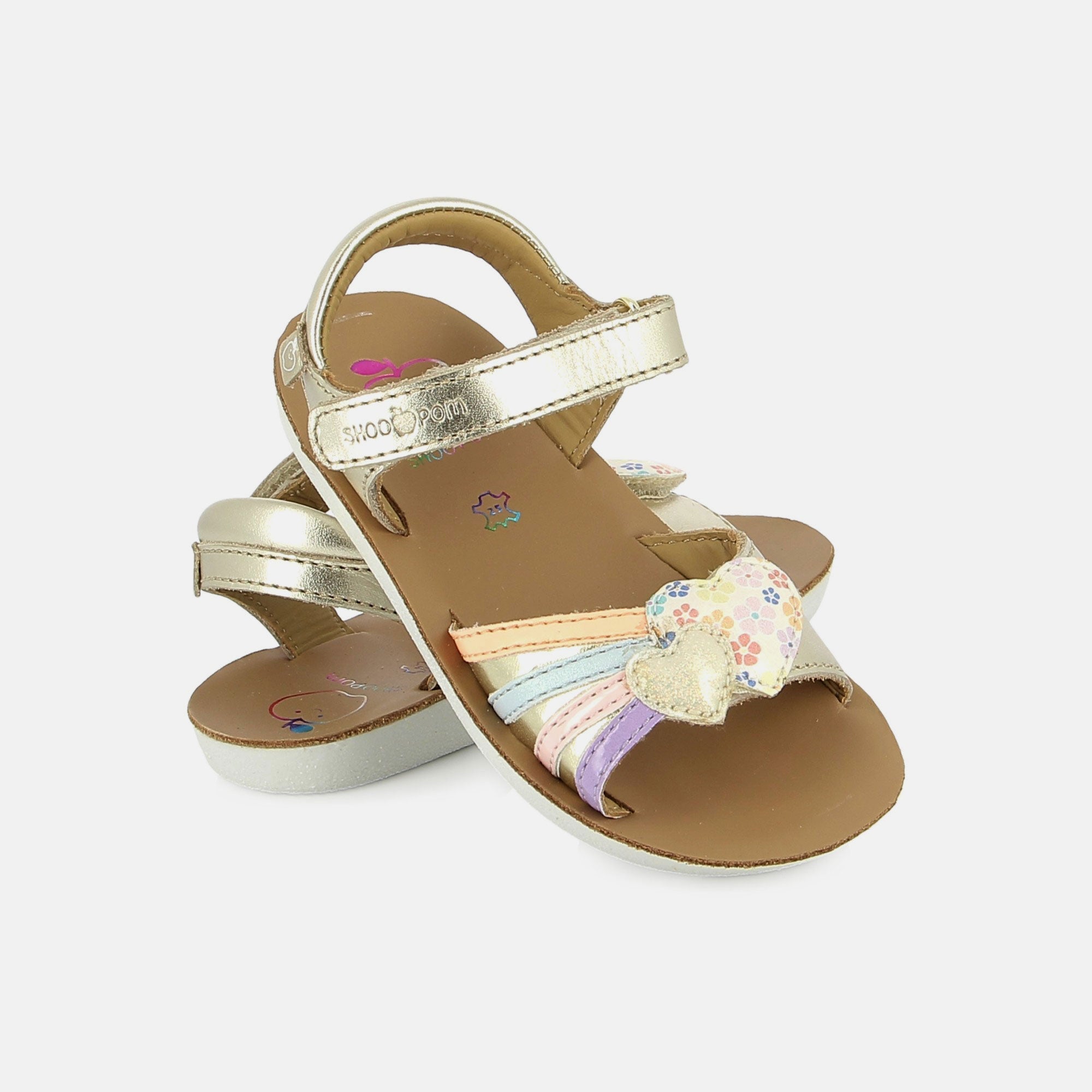 Cette sandale en cuir pour enfants est un indispensable de la saison estivale. Sa semelle extérieure est résistante, légère et souple. Sur la bride avant, son empiècement cœur métallisé et imprimé a été personnalisé en interne. Pratique à chausser, cette chaussure est dotée d’une bride à scratch à la cheville ainsi que d’une bride avant, également réglable par scratch. Pensée et développée avec expertise par notre bureau d’études en Vendée, cette chaussure réunit qualité, confort et savoir-faire Shoo Pom.