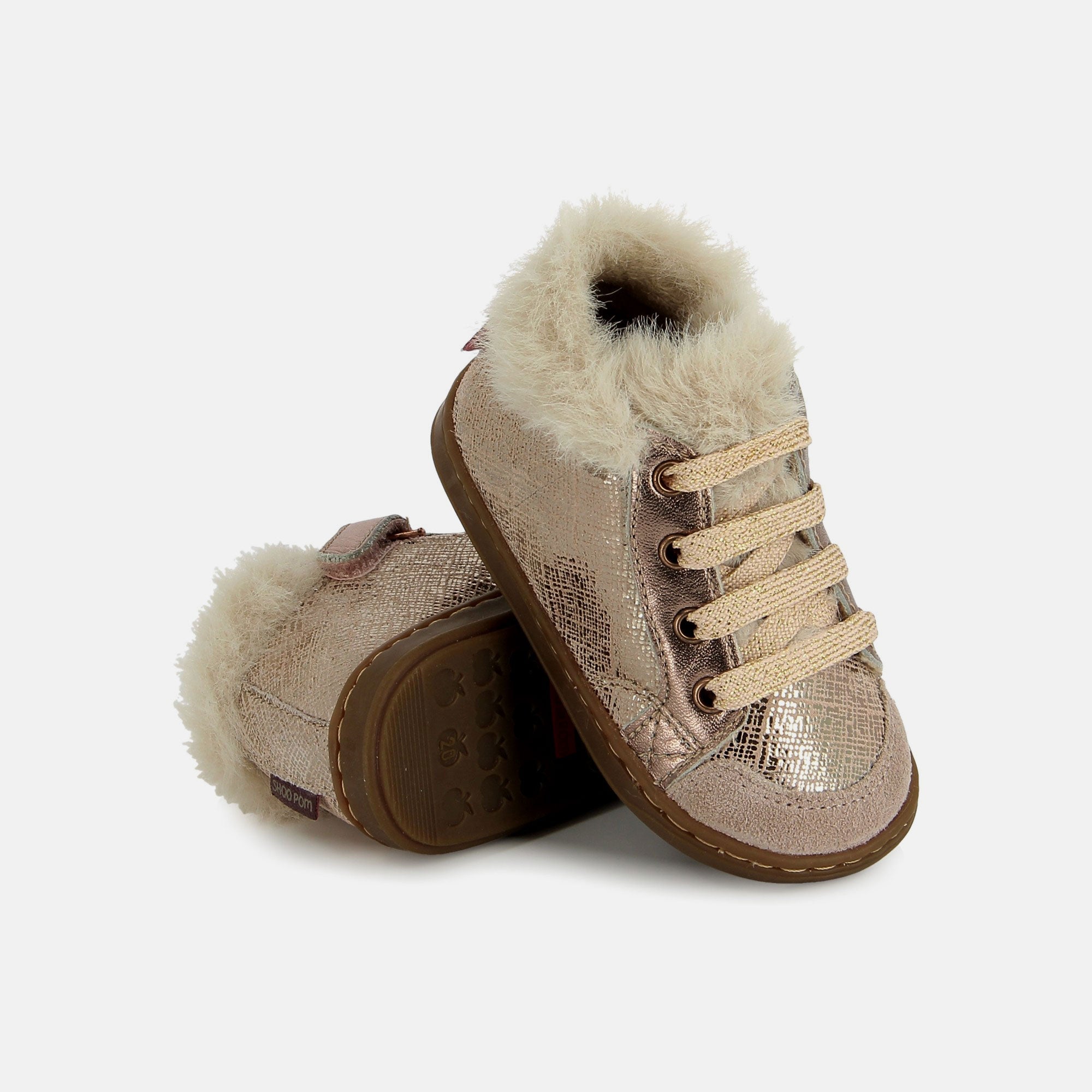 Cette chaussure premiers-pas en cuir métallisé rose et fourrée Shoo Pom a été spécialement conçue pour accompagner bébé dans l’apprentissage de la marche, en alliant confort, maintien et liberté de mouvement.