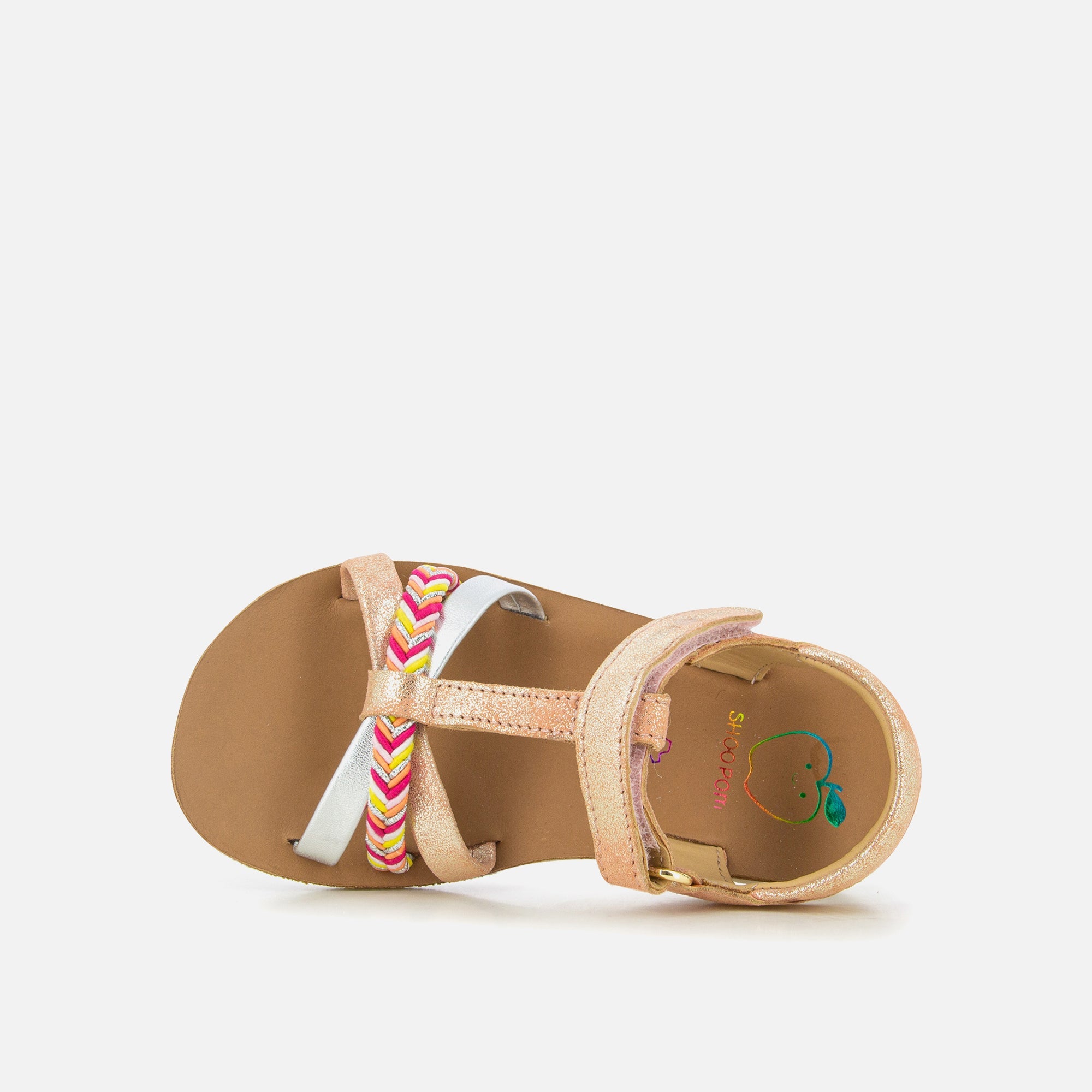 Cette sandale pour enfants est présentée dans une version en cuir velours pailleté rose, avec des brides entremêlées multicolores. Cette chaussure souple et légère est conçue avec des matériaux de qualité pour le bon développement du pied. Elle se chausse et se déchausse facilement grâce à son scratch.