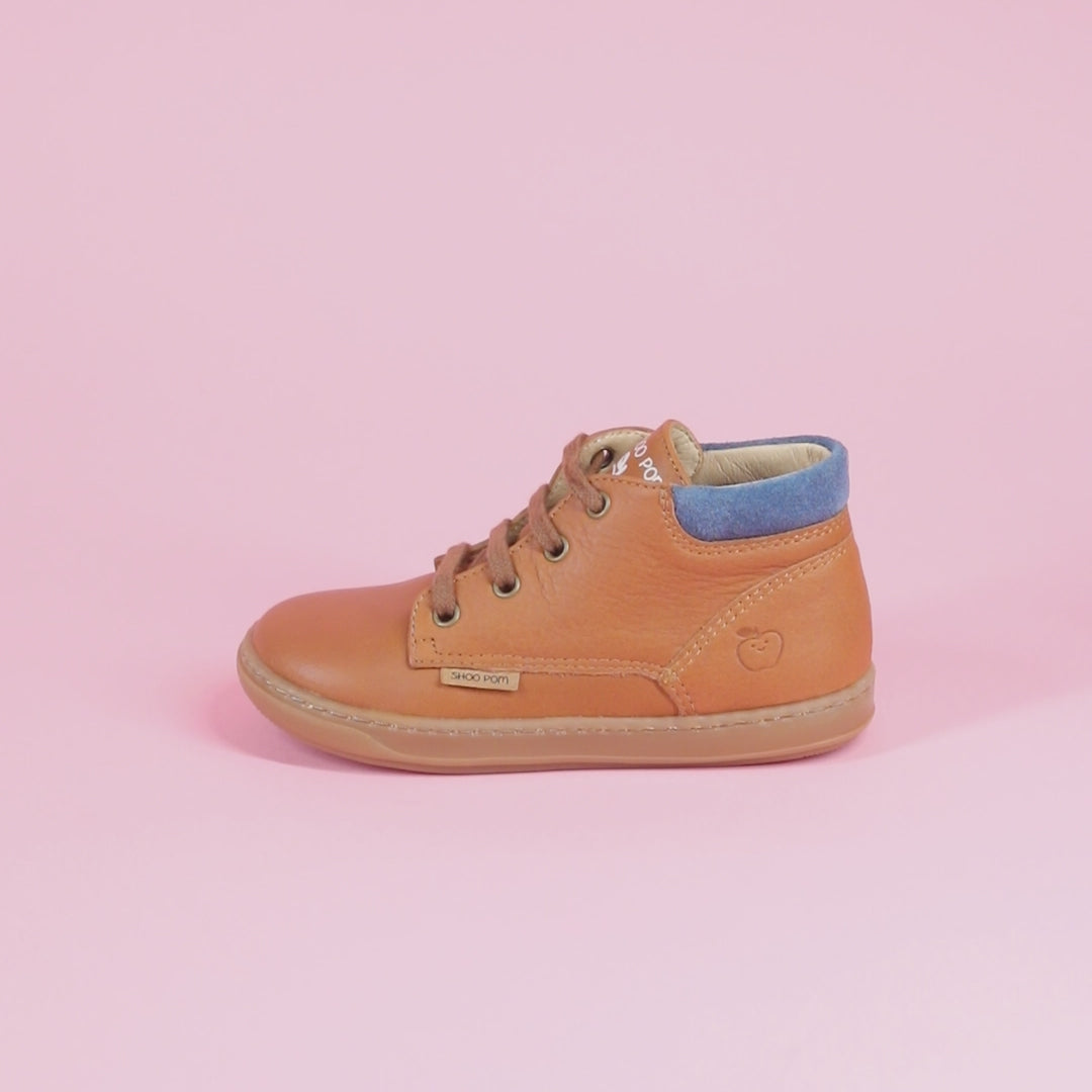 Cette chaussure premiers-pas en cuir marron Shoo Pom a été spécialement conçue pour accompagner bébé dans l’apprentissage de la marche, en alliant confort, maintien et liberté de mouvement. La tige haute à lacets garantit un maintien optimal de la cheville, tandis qu’un double zip intérieur et extérieur permet d’ouvrir entièrement la chaussure pour un enfilage rapide et facile.